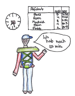 En général, on prend l'avion dans l'après-midi. Il y a deux aéroports, l'un se trouve à l'intérieur de la ville, c'est Tegel au nord. L'autre c'est l'aéroport de Schönefeld qui se trouve au sud et est en dehors de Berlin. C'est de là où je pars. Comme j'habite au centre de Berlin, je pars 2 heures environ avant que l'avion décolle. Quand il n'y a pas trop d'embouteillages, on met 45 minutes en voiture pour aller à Schönefeld. En premier, on va faire enregistrer les bagages et on passe au contrôle des passeports. Après, on monte au 1er étage et je regarde les avions sur les pistes et les camionnettes qui chargent et déchargent les valises.