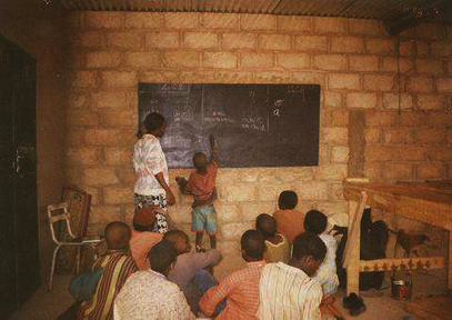 Nous écrivons tous avec des stylos à billes car c'est ce qui est vulgarisé et le moins cher, donc à la portée des bourses de nos parents. Nous écrivons tous sur des cahiers. Aucun élève n'utilise des feuilles volantes car le classement est difficile. Le toit de notre école est en tôle et les murs sont en dur (ciment). Le sol est cimenté et on ne se plaint pas car l'école est très bien construite. Nos parents ne sont pas instruits et ne comprennent pas toujours vraiment ce que nous apporte l'école. Nous avons tous des frères et soeurs qui ne viennent pas à l'école.