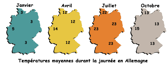 L'Allemagne est située dans une zone tempérée. et ne connait pas de grands écarts de température selon les régions comme c'est la cas en France.