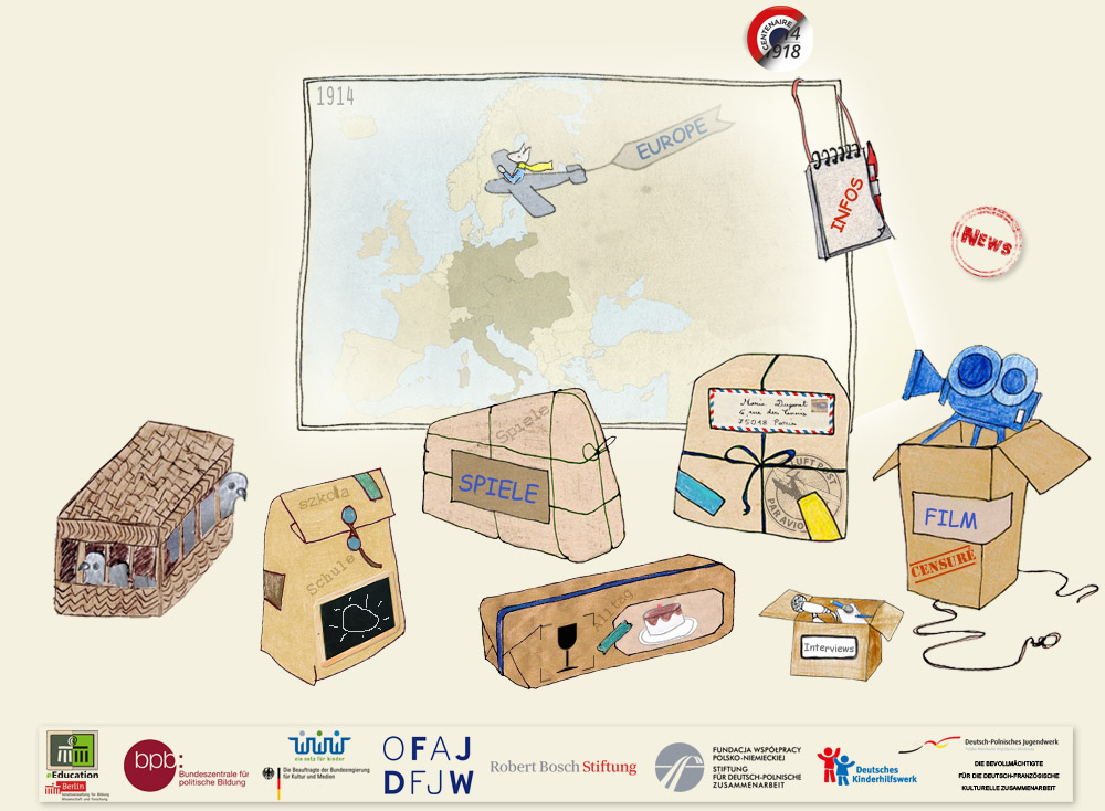 Guten Tag, ich bin Arthur, die Brieftaube. Ich begleite dich auf unserer Entdeckungsreise durch drei Länder - klick auf die Pakete, damit sie sich öffnen. Folge mir dann bei unserer Zeitreise zwischen 1914, dem Beginn des Ersten Weltkrieges, und heute!