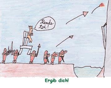hatten die Deutschen verloren. Und so haben wir in dem Geschichtsbuch links die französische Seite, rechts die deutsche Seite und in der Mitte ein Bild von Napoleon. Das ist derselbe Napoleon, aber da siehst du auf der rechten Seite die Sicht der Deutschen: Jetzt werden wir besiegt und jetzt kommt der Kaiser bis nach Berlin und wir müssen sogar seine Soldaten bezahlen... Und dann die französische Seite:Toll, wir sind bis Berlin gekommen, von Paris bis Berlin und unsere Soldaten können jetzt sogar durch das Brandenburger Tor reiten und jetzt sind wir die Herren.