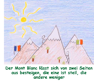 Es gibt französische, spanische, italienische, deutsche Geschichte, überall gibt es Geschichte. Ich habe einmal in meinem Leben versucht, auf den Mont Blanc zu steigen. Kennt ihr den Mont Blanc? Das ist der höchste Berg in Europa, 4810 m. Der Mont Blanc lässt sich von zwei Seiten aus besteigen, von der französischen oder von der italienischen Seite aus. Ich habe es erst von der französischen Seite aus versucht, habe es aber nicht geschafft, ich kam nur bis 3000 m. Dann habe ich es von der italienischen Seite aus probiert, aber da kam ich nur bis 2000 m, weil es so steil war. Und ich habe mir gesagt, es ist aber doch derselbe Mont Blanc. Aber zwei Aufstiege, zwei Herangehensweisen. Und dann habe ich einen Satz formuliert, der kommt jetzt in die Schulbücher und der heißt: Eine Wirklichkeit – zwei Herangehensweisen an die Geschichte. Die Menschen erleben Geschichte anders. Es gibt eine französische Sicht der Dinge und eine deutsche, und die kannst du ja nebeneinander stellen.