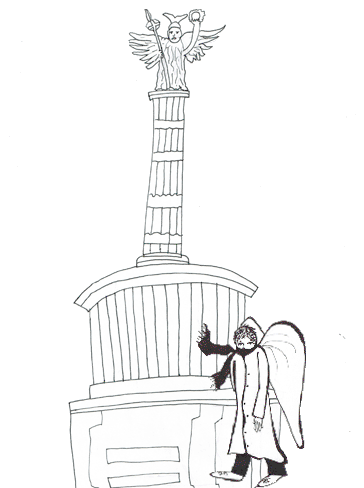 die möglichst viel herumkommen in der Stadt und mit möglichst vielen Leuten in Kontakt sind. Und da habe ich zuerst gedacht: Briefträger! Aber zu Briefträgern sind mir keine gute Geschichten eingefallen. Und dann habe ich an Feuerwehrleute gedacht, aber auch das hatte seine Grenzen. Und irgendwann ist mir aufgefallen, dass es in Berlin richtig viele Engelsfiguren gibt, in allen möglichen Ecken der Stadt, nicht nur auf Friedhöfen!