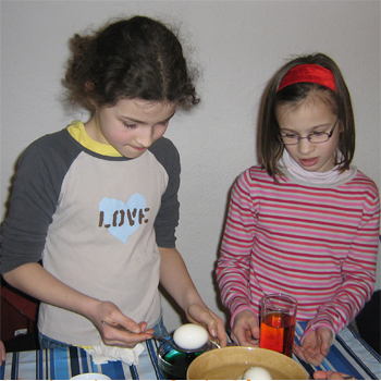 1) On utilise des oeufs durs (temps de cuisson environ 10 mn) et un colorant alimentaire spécial. On trouve ce colorant dans tous les supermarchés allemands avant Pâques. Il faut en plus : des gobelets en plastique ou des vieux verres et du vinaigre de vin.