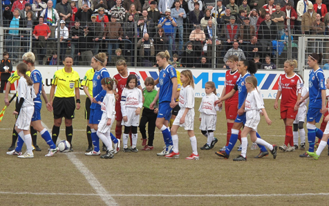 Die Spielerinnen betreten das Spielfeld, begleitet von Nachwuchs-Spielerinnen.