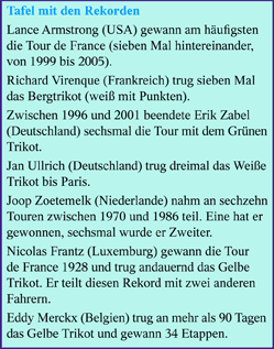 Einige Infos über den Verlauf des Rennens:Die Tour de France beginnt fast immer mit dem so genannten Prolog, einem kurzen Einzelzeitfahren von circa sieben Kilometern. Dadurch ergeben sich die ersten Unterschiede in der Gesamtwertung. Die darauf folgenden sechs Etappen führen durch das Flachland und sind für die Sprintspezialisten.