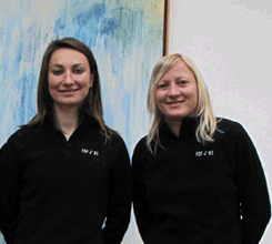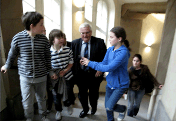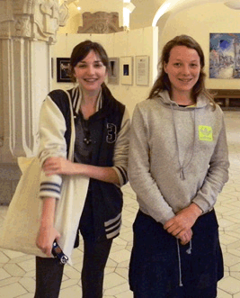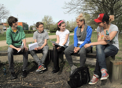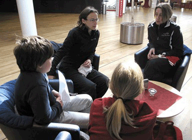 Anja Mittag (en bleu), joueuse de l'équipe d'Allemagne et championne du monde en 2007 et Anna Felicitas Sarholz, meilleur espoir de 2010, en compagnie des reporters du Grand méchant loup. Elles sont toutes les deux très contentes d'avoir pu faire de leur passion un métier.