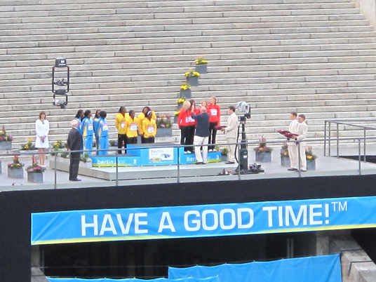 Les athlètes allemandes du 4x100 m relais reçoivent leurs médailles.
