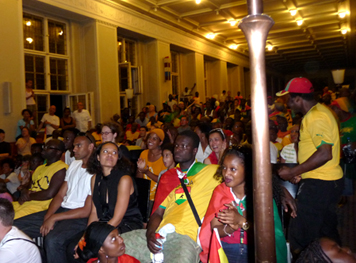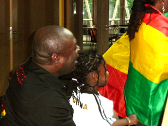 Die Stimmung steigt auch bei den Fans der Ghanaer: hier vor dem Eingang des Nordrhein-Westfälischen Vertretung in Berlin.