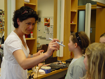 Anschließend gingen wir in den Schminkraum, die sogenannte Maske. Dort hatten wir das Glück, der Maskenbildnerin Christiane ein paar Fragen über ihren Beruf stellen zu können: