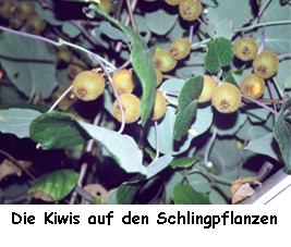 Um neue Kiwistöcke zu haben schneidet man ein Stück von der Schlingpflanze ab und pflanzt es ein. Und wie bei anderen Bäumen auch, braucht man weibliche und männliche Pflanzen, um Früchte zu bekommen. Man erkennt sie an den Blüten, weibliche Blüten haben kleine braune Stempel, männliche nicht.