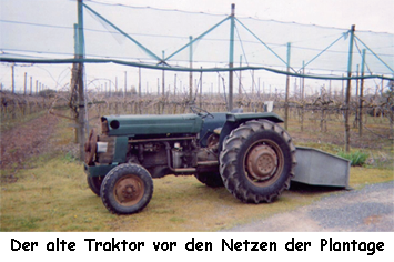 Ende Oktober ist die Ernte. Jeder sammelt eine Tonne Kiwis pro Tag. Die Früchte kommen in eine Kältekammer von 2° C. Nimmt man sie heraus, gibt es einen Wärmeschock, das heißt die Temperatur steigt von 2° auf 15° oder 16° C und dadurch reift die Kiwi. Geerntet wird sie immer grün und ganz hart, essen kann man sie noch nicht. Die ersten werden Mitte November verkauft und die Saison endet Anfang Mai.